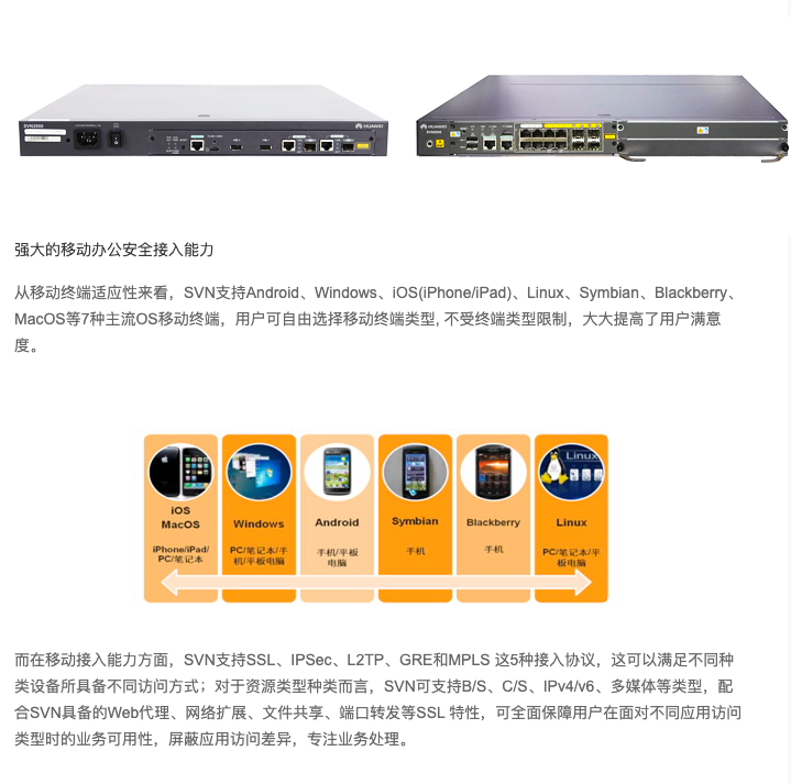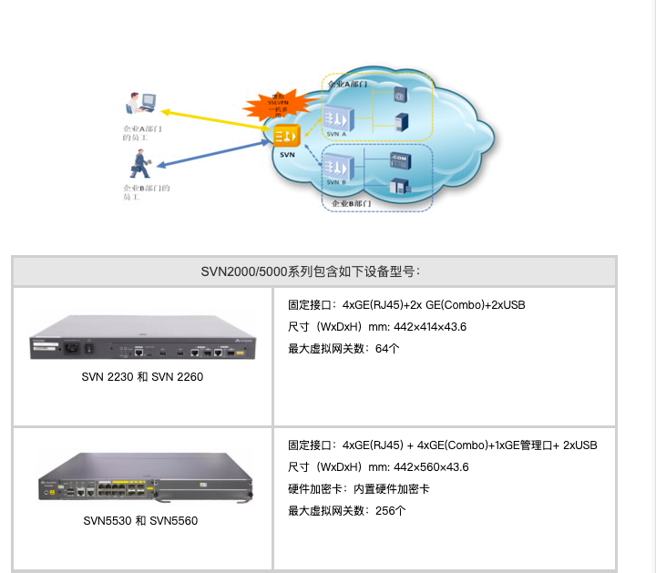 SVN2000/5000系列産品是(shì)華為(wèi>&)公司最新推出的(de)一(yī)系列安全接入網關,采用(yòng)電←₹≤₩(diàn)信級的(de)可(kě)靠硬件(jiàn)平台,安βφσ全的(de)實時(shí)嵌入式操作(zuò)系統,為(wèi)大(dà✘↔→)中企業(yè)、政府、運營商提供了(le)遠(←<φyuǎn)程接入、移動辦公、分(fēn)支機(→© γjī)構互聯、雲接入、多(duō)媒體(tǐ)隧道(dào) ≠↔±接入等安全解決方案。